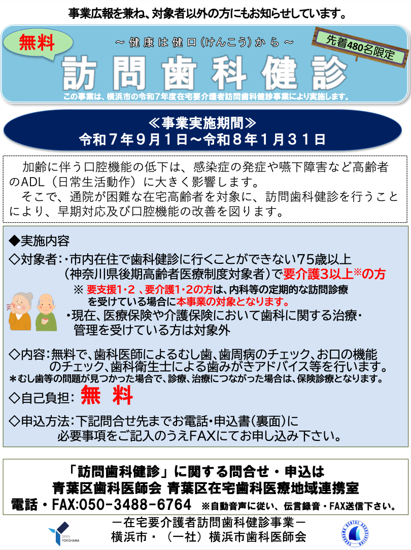 9月1日より、横浜市の令和7年度在宅高齢者訪問歯科健診事業による「訪問歯科健診」が始まりました。